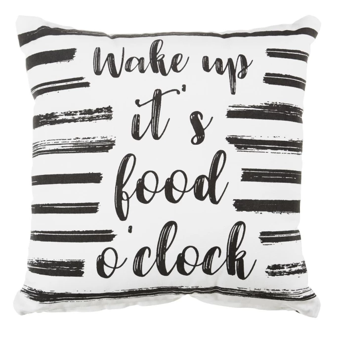 Das Dekokissen Ebba von Beddinghouse ist ein cooles Accessoire. Auf der Vorderseite findet sich auf schwarzem Untergrund aus unregelmäßigen schwarzen Streifen die Aufschrift “Wake up it’s food o’ clock”. Die Rückseite trägt ein Muster aus schwarzen Kreuzen und kleinen Punkten, das an das Stadtwappen Amsterdams erinnert. Das Kissen ist in Schwarz und Weiß gehalten. Das Zierkissen von Beddinghouse ist aus reiner Baumwolle gefertigt und misst 43 x 43 cm. Das Kissen hat an der Unterseite einen Reißverschluss und wird mit einem formbeständigen Füllkissen geliefert. Holen Sie sich mit diesem Dekokissen, das besondere Etwas in Ihr Zuhause!