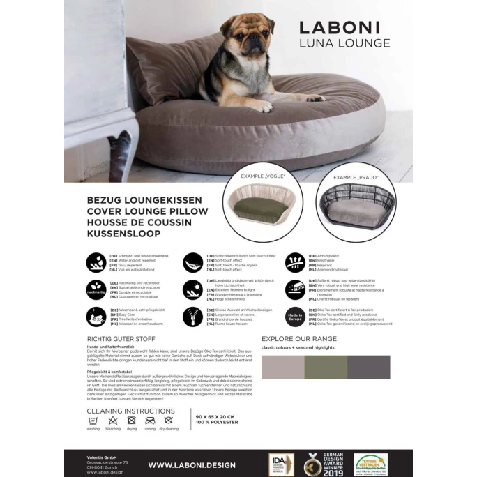 Ob als edler Blickfang inmitten Ihrer Wohnlandschaft oder als gemütliche Kuschelecke – das LUNA Loungekissen OXFORD von LABONI wird überall zum neuen Lieblingsplatz für Ihren Vierbeiner. Dank des intelligenten Designs mit einer geraden Seite kann das LUNA Hundebett perfekt gegen eine Wand platziert werden und bietet zusammen mit dem im Set enthaltenen Deko-Kissen eine herrliche Oase der Ruhe. Ob Füllung oder Bezug, alle Materialien sind Öko-Tex® Standard 100 zertifiziert, waschbar, für Allergiker geeignet und zudem auch einzeln erhältlich, damit Sie Ihrem Hundebett jederzeit einen neuen Look verpassen können. Die dick gepolsterte Matratze aus 3D-gekräuselter silikonisierter Hohlfaser unterstützt und entlastet die Gelenke Ihres Hundes. Diese Art der Füllung wird sonst bei Luxusbettwaren verwendet und bietet höchste Komforteigenschaften: atmungsaktiv, klimatisierend, antibakteriell, geräusch- und geruchlos, daunenähnlich weich und auch nach vielen Wäschen äußerst formbeständig – kein Durchliegen. Der edle Samtbezug ist dank der hochwertigen Verarbeitung und der besonderen Materialqualität besonders langlebig. Für höchsten Komfort ist die Oberfläche schmutz- und wasserabweisend ausgerüstet und wie das Inlett waschbar bei 30°C. Das bei diesem exklusiven Marken-Produkt wirklich an alles gedacht wurde, beweist der verdeckte Reißverschluss, welcher den Verschluss vor Knabber-Versuchungen bewahrt. In verschiedenen Farbvarianten fügt sich das LUNA Loungekissen OXFORD von LABONI somit stilvoll in jedes gehobene Wohnambiente ein und bietet Vierbeinern perfekten Schlafkomfort.